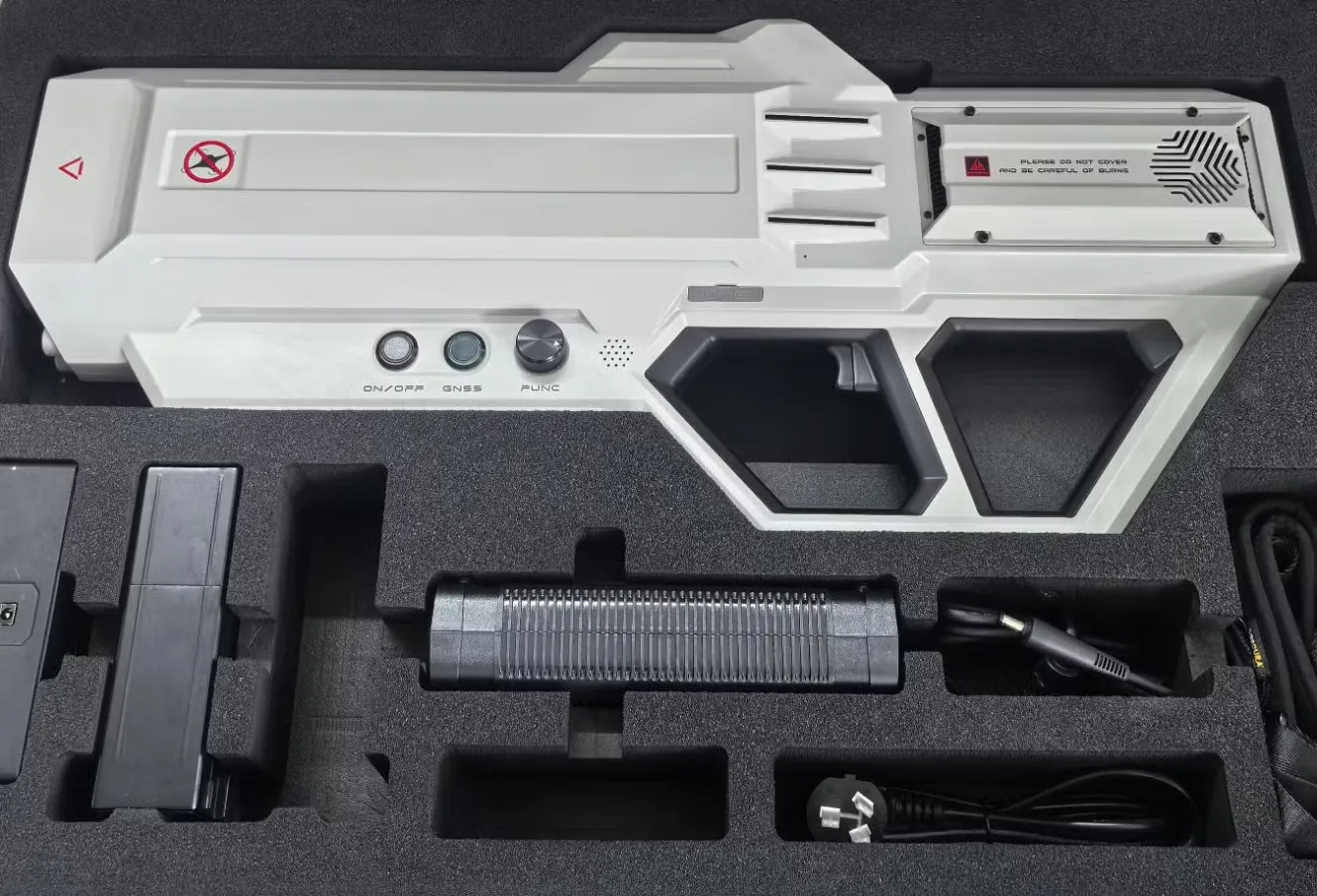 Su diseño portátil tipo rifle permite una operación rápida y eficiente en campo, mientras que su sistema de antenas y amplificadores de potencia cubre múltiples bandas de frecuencia utilizadas por drones comerciales y profesionales.