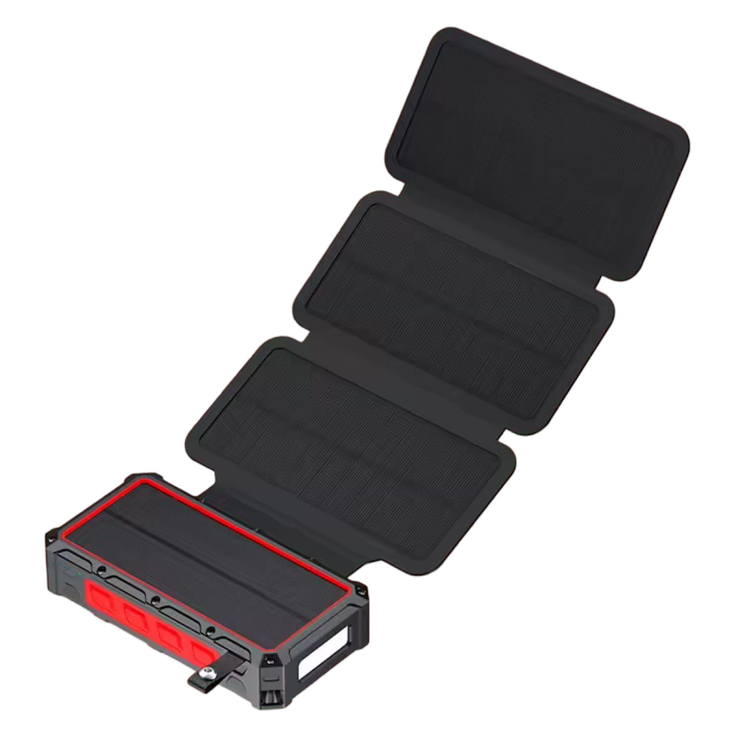 Este modelo integra cuatro paneles solares plegables, que permiten aprovechar la energía del sol para mantener la batería cargada durante actividades al aire libre. Además, cuenta con una manivela manual tipo dinamo, que genera energía mediante rotación, proporcionando una alternativa de carga cuando no se dispone de electricidad.